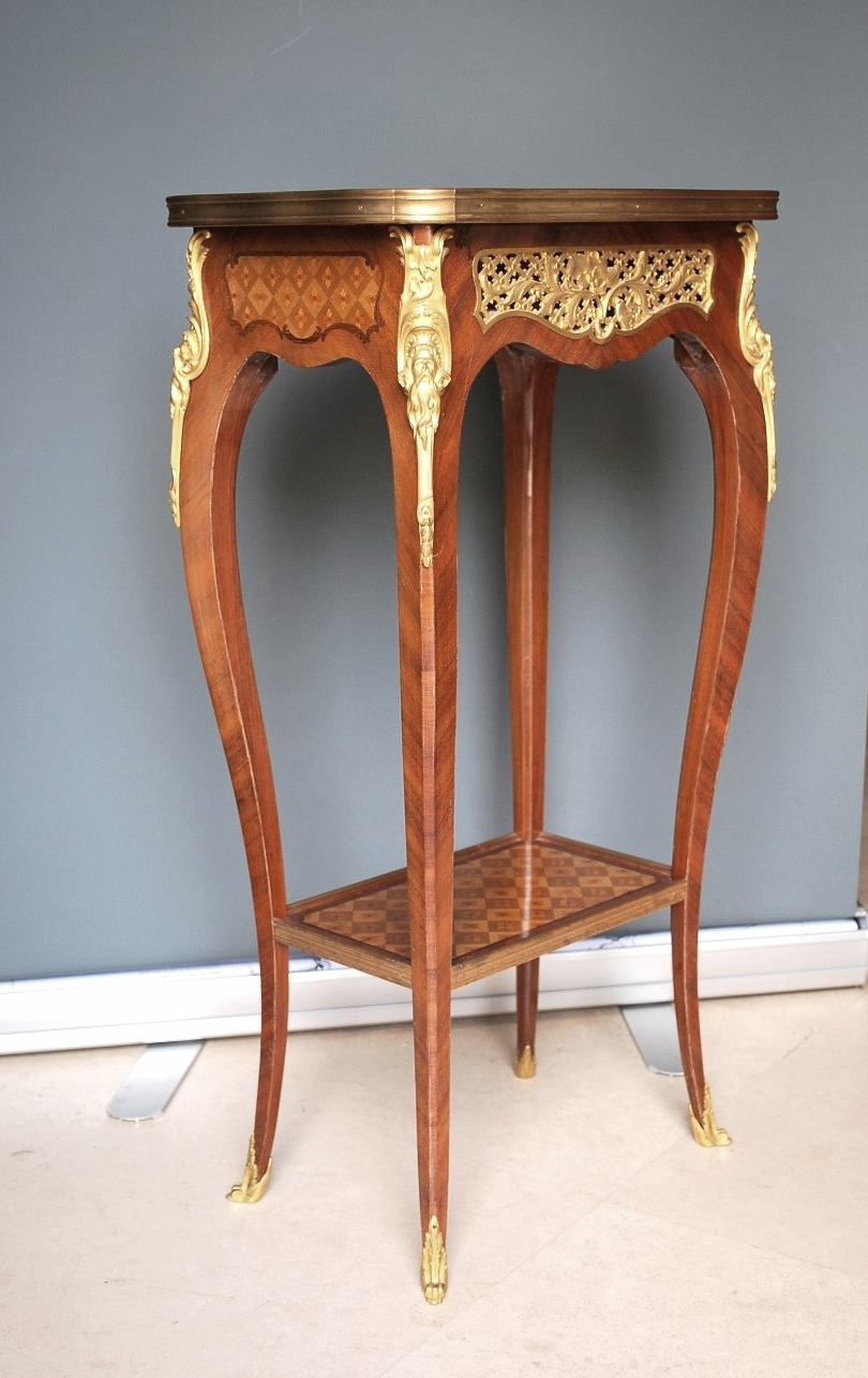 Placage bois de violette, marqueterie damiers à fleur, bronzes, pieds galbés et tablette d'entrejambe